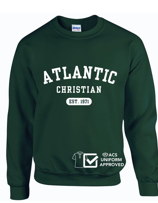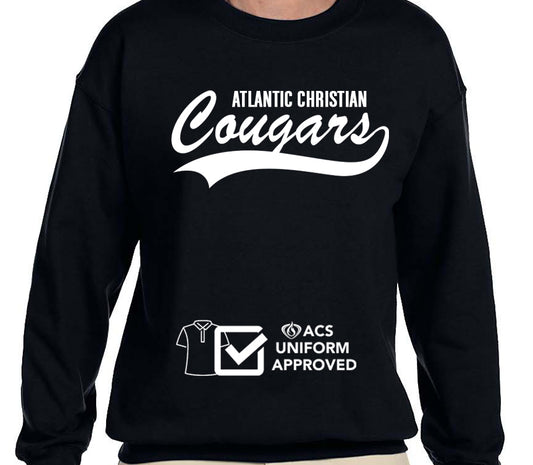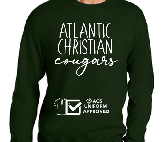 ACS Uniform-Approved Crew Sweatshirt with Atlantic Christian Cougars White Lettering - Available in Black, Dark Green, and Gray