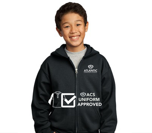 ACS Uniform-Approved Sweatshirt - Zip-Up Hoodie with ACS Logo in White. Available in Black & Dark Green